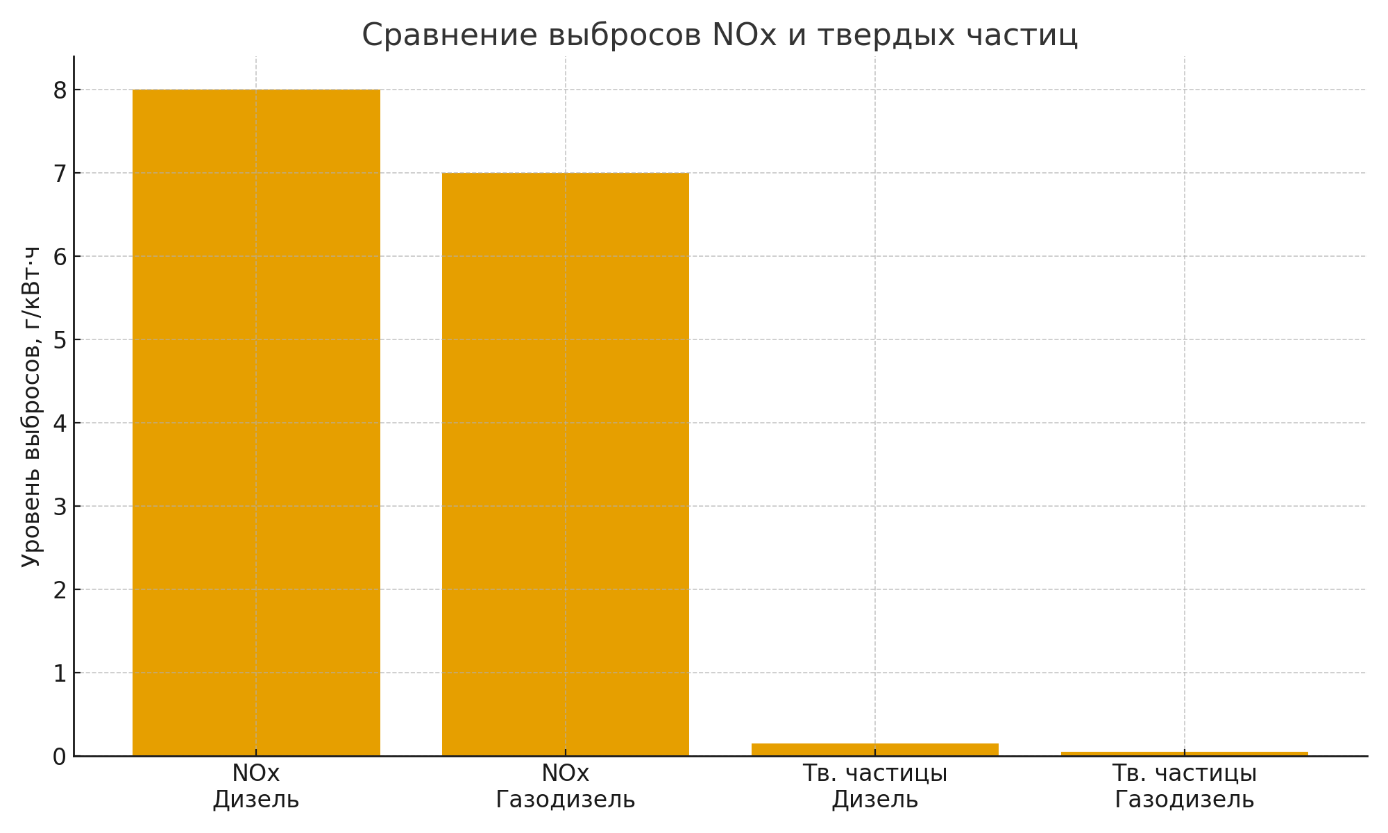 Анализируя график, можно сказать, что он демонстрирует при переводе двигателя на газодизельный режим выбросы NOx снижаются примерно на 10–15 % вследствие более равномерного температурного поля и возможности корректировки угла опережения впрыска. Еще более заметно уменьшаются выбросы твердых частиц: их уровень падает более чем в три раза, что объясняется отсутствием образования сажи при сгорании метана и меньшей долей зон локального переобогащения.
