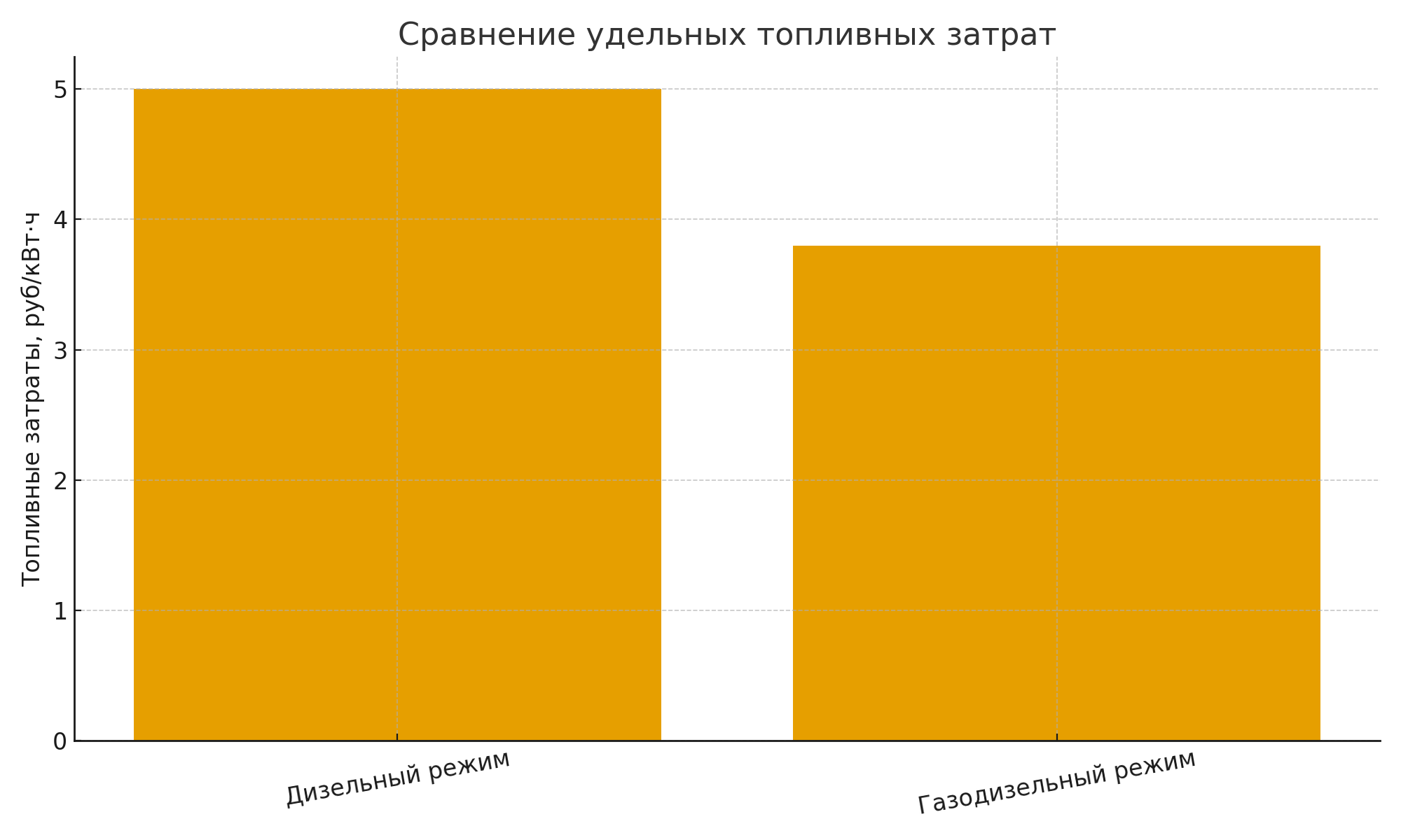 Анализируя график, можно сказать, что сравнение удельных топливных затрат показывает, что за счет использования более дешевого метана суммарные расходы на топливо в газодизельном режиме снижаются примерно на 20–25 % по сравнению с традиционным дизельным режимом при сопоставимой полезной мощности. Экономический эффект усиливается при росте долизамещения дизельного топлива газом и увеличении годового моточасового ресурса техники.