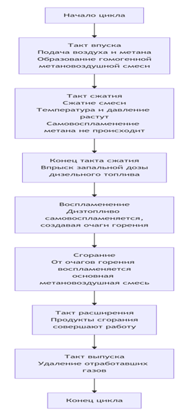 В конце такта сжатия в цилиндр впрыскивается небольшая порция дизельного топлива через стандартную топливную аппаратуру. Дизельное топливо, обладающее меньшей температурой самовоспламенения, образует локальные очаги горения, от которых воспламеняется основная метановоздушная смесь. Таким образом, запальная дизельная порция выполняет роль инициатора горения, а основная часть подводимой теплоты обеспечивается за счет сгорания газа.