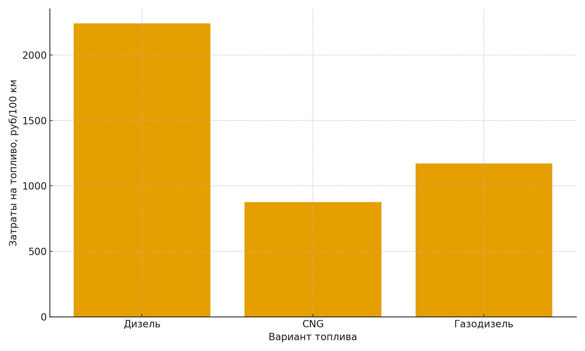 Рисунок 1. Сравнение затрат на топливо для дизеля, CNG и газодизельного режима (руб/100 км)