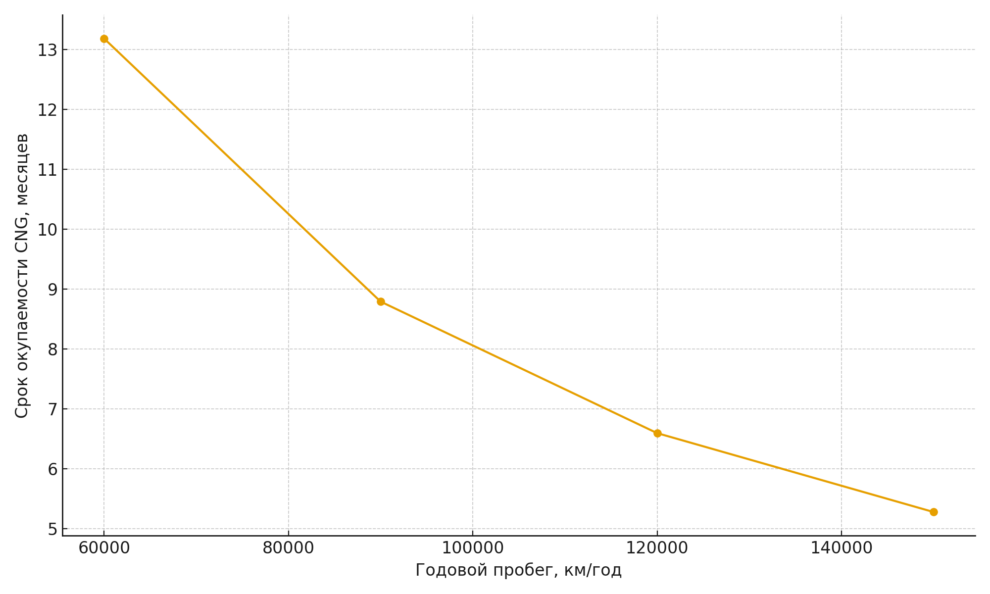 Рисунок 3. Срок окупаемости внедрения CNG (в зависимости от годового пробега, оценочно)