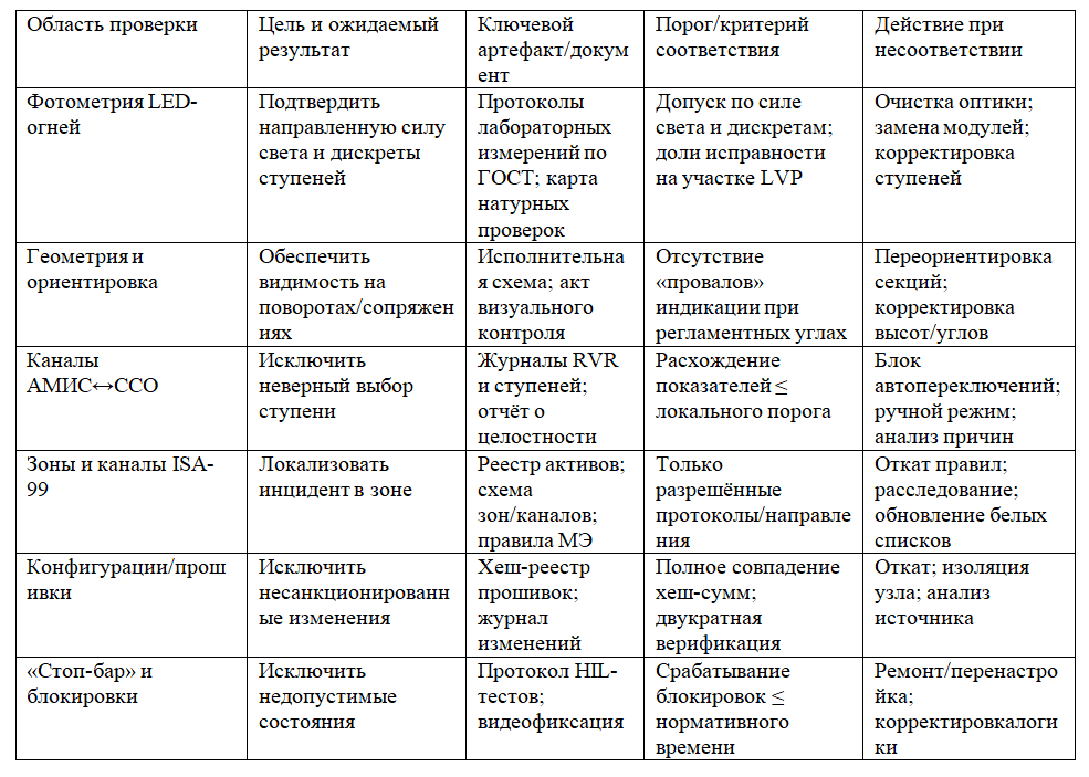 Разработанные рекомендации по подготовке к аудиту и постоянному совершенствованию включают завершённый контур действий. На подготовительном этапе формируется «паспорт ССО» с параметрами огней, схемами питания, секционирования и вариантами LVP; выполняется эталонирование лабораторных измерений по ГОСТ и планирование натурных проверок под репрезентативные метеоусловия, чтобы расчёт RVR отражал фактическую яркость. На архитектурном уровне внедряется зонно-канальная модель с минимально достаточными межзоновыми связями, белыми списками протоколов\портов и неизменяемыми журналами, что позволяет локализовать инциденты и документировать управляющие воздействия. На эксплуатационном уровне закрепляется цикл очистки оптики и проверки геометрии, вводятся пороги, при которых ступень яркости не может быть понижена без подтверждения, а также процедуры разбора всех случаев расхождения RVR с визуальной оценкой. На уровне непрерывного улучшения матрица угроз и уставки детектирования пересматриваются по итогам инцидентов и тренингов, а KPI по времени обнаружения/восстановления и долям исправности включаются в цели подразделений.