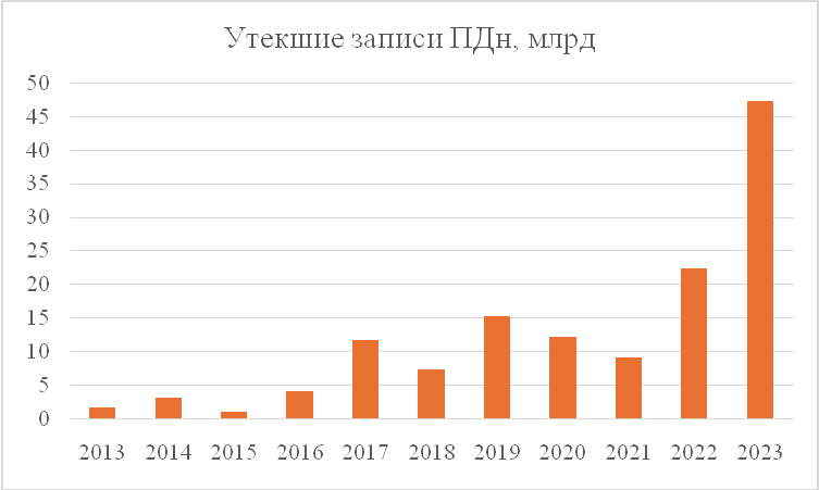 Рисунок 2. Количество утекших записей ПДн в мире, 2013-2023