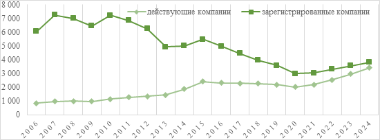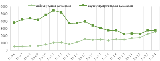 На графиках 2, 3, 4 показаны графики зарегистрированных и действующих компаний (всех форм собственности) за период 2006-2024 гг. Графики компаний производственной сферы и занимающихся научно исследовательскими разработками (график 3 и график 4) схожие между собой заметно отличаются от графика регистрации компаний в целом. Сокращение, в том числе для компаний в целом, числа регистрации в 2013 году, поступательное снижение на протяжении 6 лет и небольшой рост начиная с 2022 года для производственных предприятий и с 2023 года для предприятий научной сферы [8].
