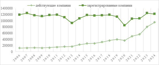 График 2. Отношение зарегистрированных к действующим компаниям в РФ за 2006-2024 гг. (ОКВЭД2: все) [8]