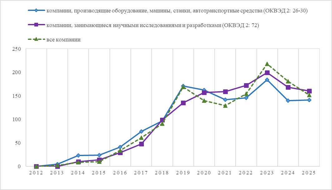Резкое сокращение регистраций в 2013 году зафиксировано по всем секторам. Этот период совпал с замедлением экономического роста, усилением регуляторной нагрузки и первыми признаками внешнеэкономической нестабильности. В 2014-2020 годах видна устойчивая отрицательная динамика регистраций как для промышленности, так и для сектора НИОКР и расхождение траекторий с общим рынком. Причины являлись: санкции 2014 года, девальвация рубля (рост курсов доллара на 96 %, евро на 64 %), удорожание кредитов из‑за повышения ключевой ставки, логистические сбои и рост издержек на импорт оборудования, кадровый дефицит из-за оттока специалистов. С 2022 года в производственном секторе (график 4) наблюдался небольшой рост регистраций, а с 2023 года в секторе НИОКР. Это результат госпрограмм поддержки импортозамещения (льготное кредитование, преференции в госзакупках), спрос на локализацию производства в условиях санкций, усиление финансирования НИОКР для разработки отечественных аналогов [8].