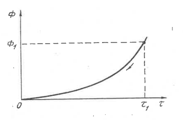 Рисунок 1. Схематическое изображение траектории самопроизвольного перехода изолированной системы из неравновесного состояния (Ф1, τ 1) в равновесное состояние (0, 0)