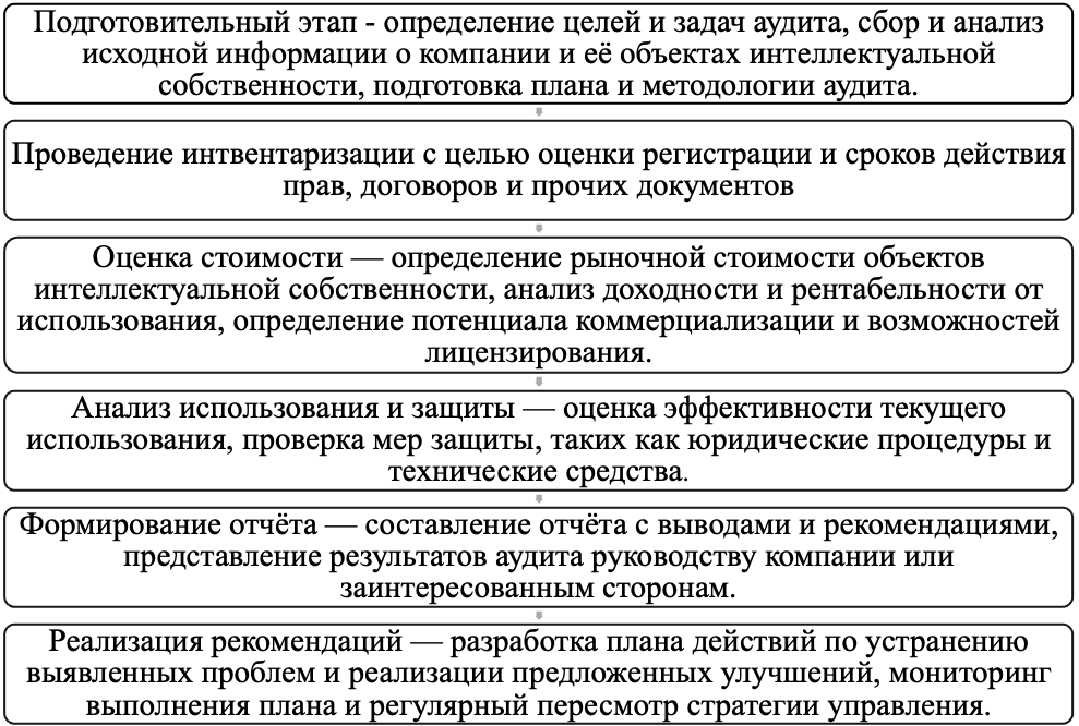 Представленные выше задачи решаются посредством проведения последовательных этапов, позволяющих аудитору сформировать полноценное понимание специфики развития объектов интеллектуальной собственности, а также определяющее рекомендации, которые могут быть использованы руководством компании для выявления направлений развития хозяйственной деятельности и повышения качества использования отдельных объектов. С целью наиболее наглядного представления они проиллюстрированы на рисунке 1.