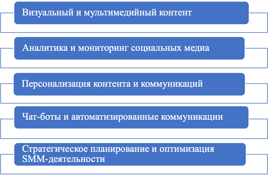 Использование искусственного интеллекта в сфере медиакоммуникаций оказывает глубокое влияние на привычные профессиональные подходы. Эксперты считают, что ИИ не ограничивается лишь заменой рутинных задач, но и меняет принципы стратегического планирования, создания контент-планов и коммуникации с целевой аудиторией [3, с. 11]. В сфере SMM данные изменения проявляются особенно ярко, поскольку социальные сети являются динамичной и технологически насыщенной средой.
