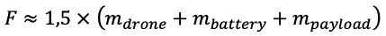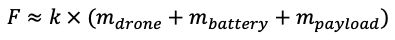 Для определения требований к силовой установке введем частную модель вычислений, связывающая массу дрона с необходимой для полёта тягой (формула 1).