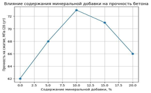 Результаты испытаний прочности бетона на сжатие в зависимости от содержания микрокремнезёма представлены на рисунке 2. Анализ данных показывает, что введение микрокремнезёма в количестве до 10% от массы цемента приводит к монотонному увеличению прочности. Максимальный прирост прочности (около 20% по сравнению с контрольным составом без добавки) наблюдается при содержании микрокремнезёма 8-10%. При дальнейшем увеличении дозировки до 15-20% рост прочности замедляется, а в некоторых случаях наблюдается незначительное снижение.