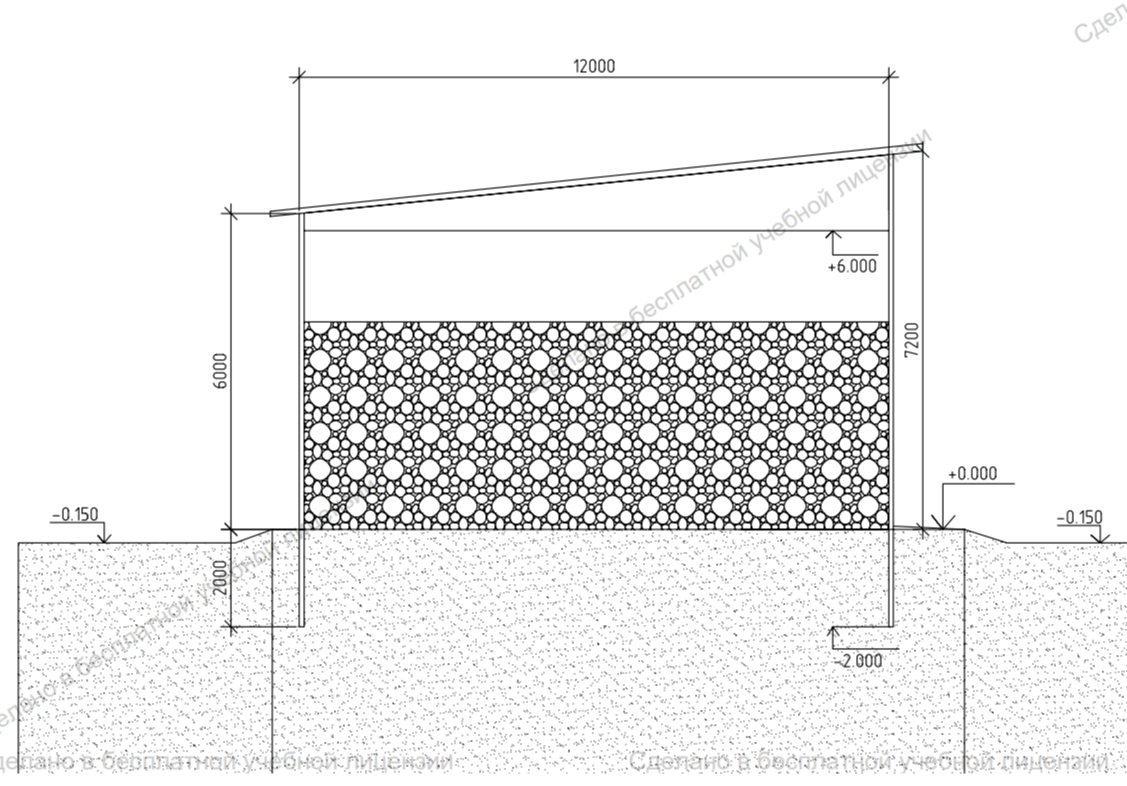 После того как было подобран пролет, мы приступаем к проектированию стенок зернохранилища. Для этого необходимо выполнить поперечное сечение (см. приложение). В данном сечении было определено, что высота стенки от уровня грунта будет составлять 5.1 м. Данный размер будет обуславливаться нормами на постройку зернохранилищ, а также удобством для погрузочной техники ГОСТ 12525-2012. Данная длина стенки была подобрана расчетом на прочность и устойчивость. В качестве нагрузки была учтена продовольственная нагрузка зерна (пшеница, ячмень). А также ветровая нагрузка.