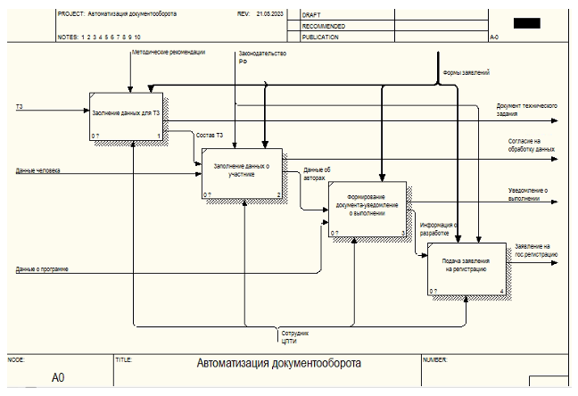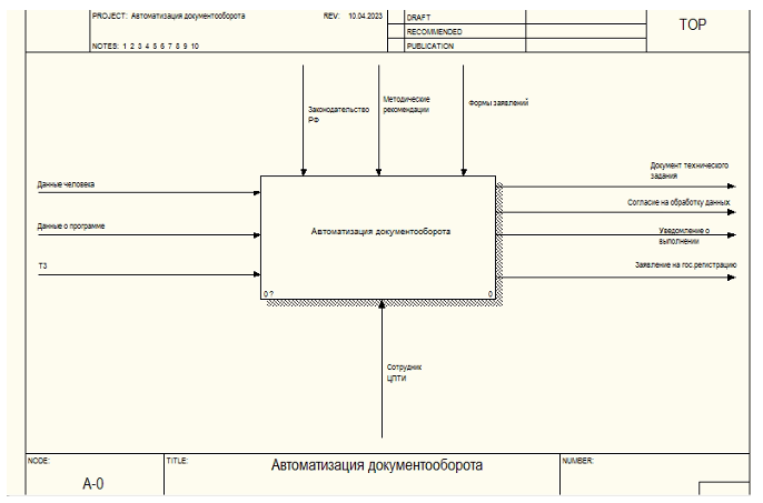 Для более подробного осмотра механизма работы документооборота следует рассмотреть схему IDEF0 [3]. Контекстная IDEF0 диаграмма представлена на рисунках 1, 2.