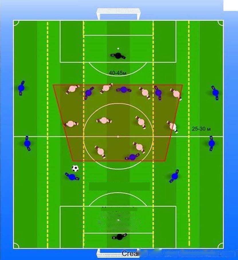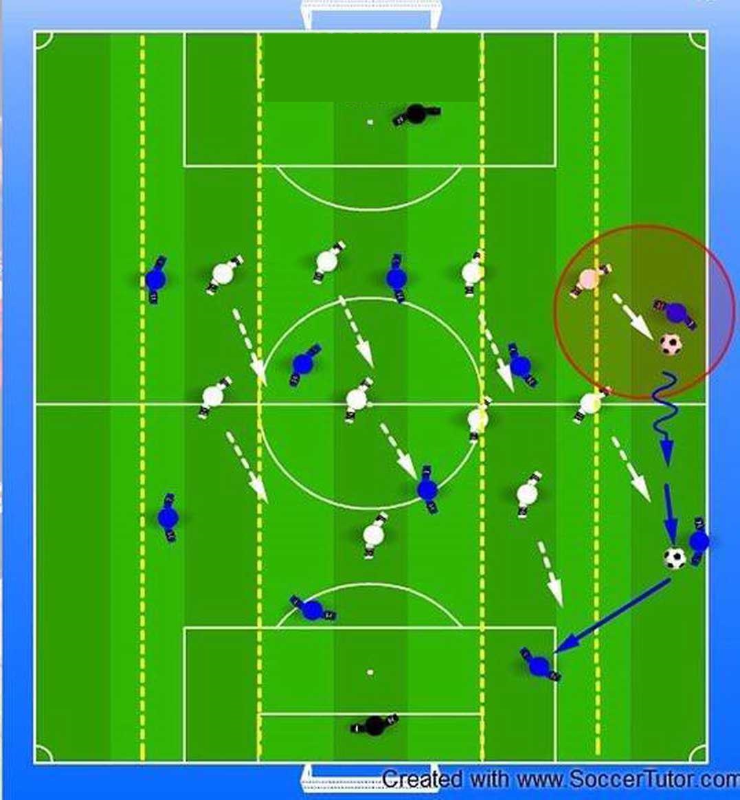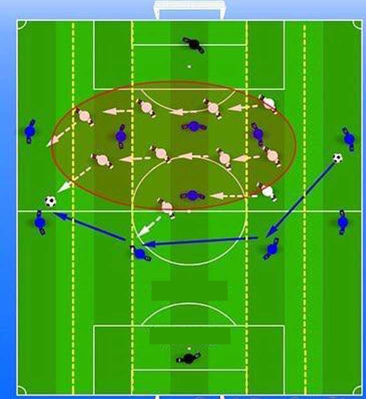 При переводе мяча с фланга на фланг игроки, организованно перемещаются за мячом, сохраняя оптимальное расстояние между собой по фронтальной и вертикальной оси поля и защищая три вертикальных коридора из пяти (рисунок 6).