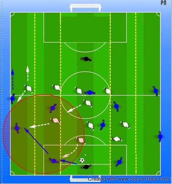 Пара нападающих первой линии в зоне 3 располагается так, чтобы мяч от вратаря получал ЛЦЗ соперника. Один из двойки оказывает давление, направляя соперника во фланг (рисунок 2). Прессингующие ППЗ и ПЗ также ждут эту передачу и готовы активно вступить в отбор.