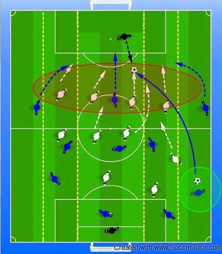 Защитники в момент передачи за спину должны располагаться вполоборота и быть готовыми к спринту. Как только сыгран мяч, защитники возвращаются на исходные позиции, а полузащитники участвуют в подборе мяча.