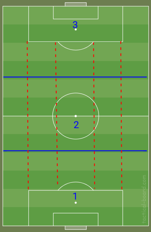 Для начала разделим футбольное поле на 3 зоны по глубине и 5 коридоров по ширине (рисунок 1).