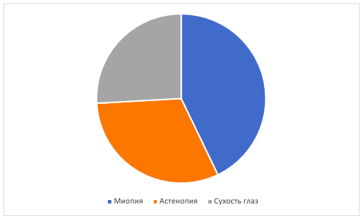1. Миопия (близорукость). Миопия является ведущей патологией среди лиц молодого возраста. Миопия слабой и средней степени диагностируется у 56% студентов медицинских вузов, часто двухсторонняя, возникающая в 55% случаев в 12–17 лет [7].