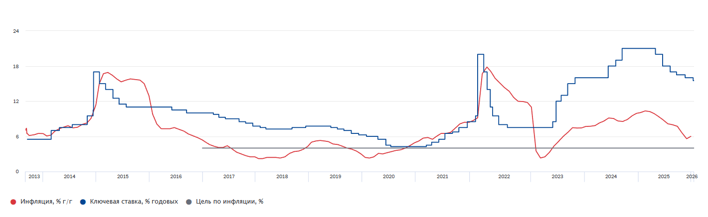 Рисунок 1. Динамика инфляции и ключевой ставки Центрального Банка Российской Федерации за 2013-2026 гг. [10]