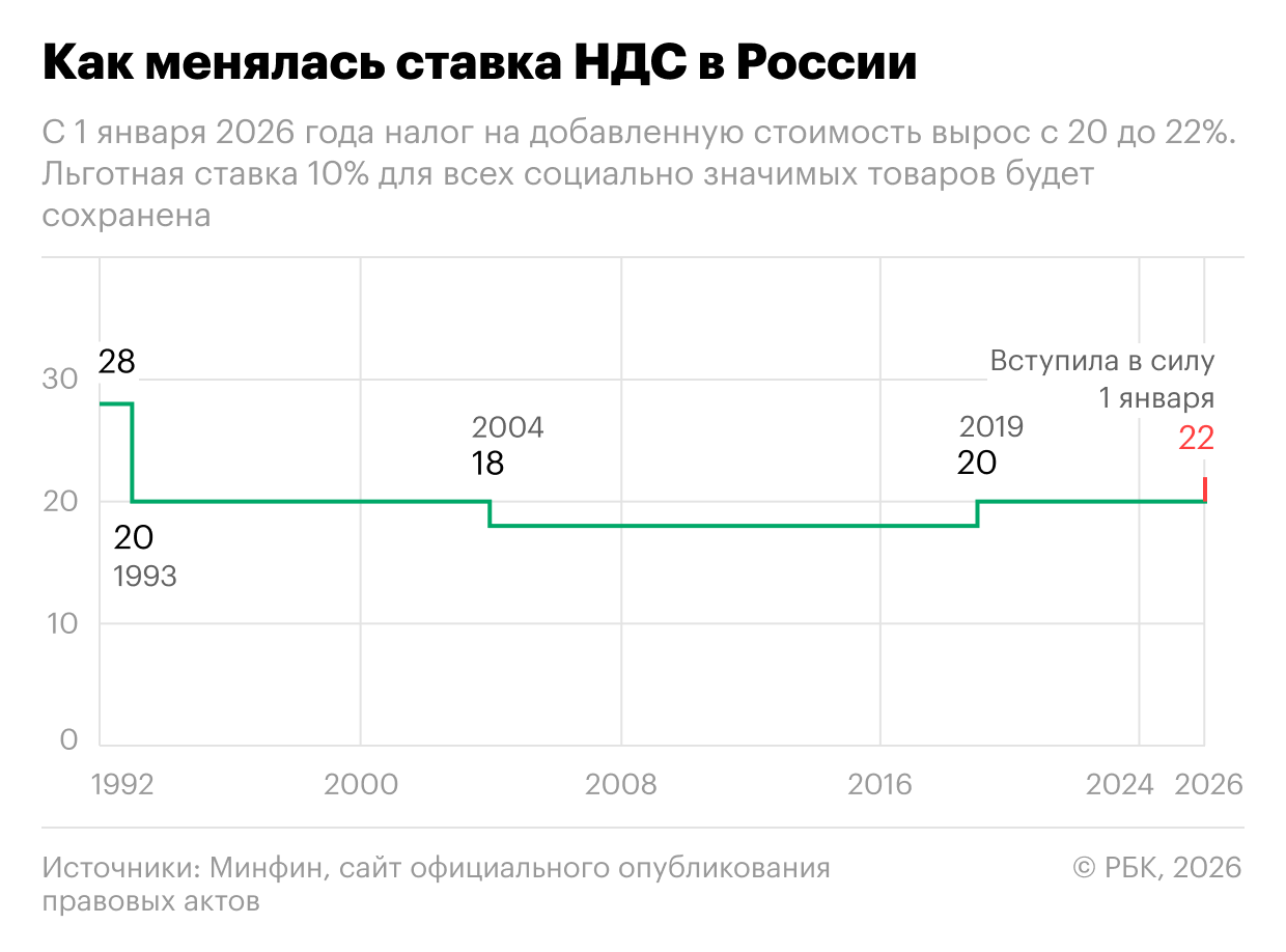 Рисунок 2. Динамика ставки НДС в период с 1992 г по 2026 г [11]