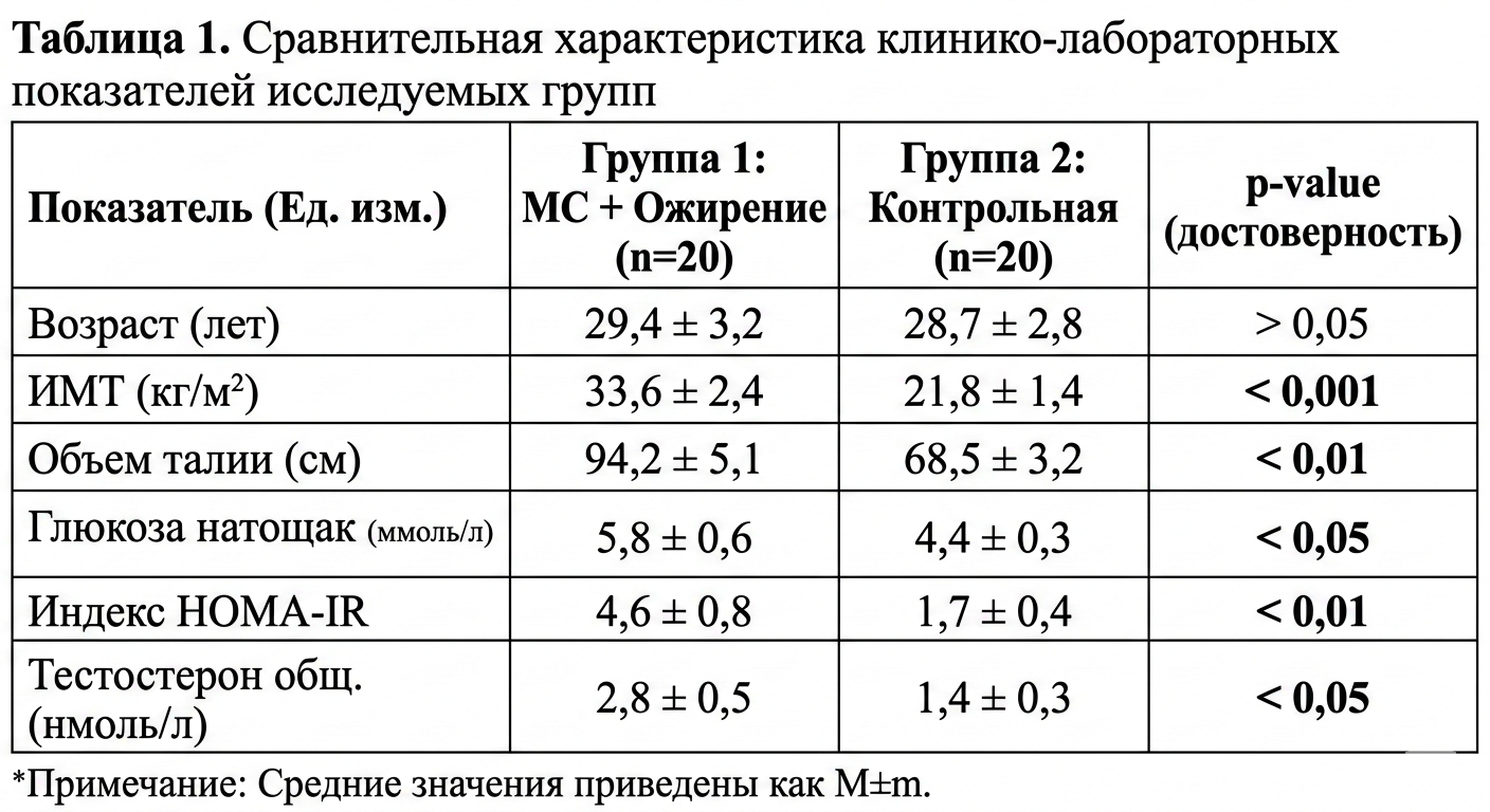Нами был проведен ретроспективный анализ 40 клинических случаев пациенток в возрасте от 23-38 лет . Где основную группу составили женщины и ИМТ более 30 кг/м^2 , и нарушениями менструального цикла (n=20)., контрольную это женщины с нормальным ИМТ (n=20).