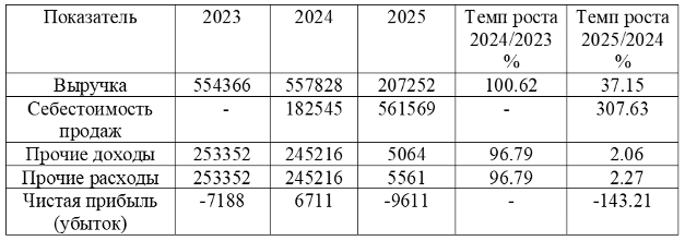 Анализ финансовых результатов свидетельствует о нестабильной динамике экономических показателей предприятия [3, с. 658]. Несмотря на положительный финансовый результат в 2024 году, уже в 2025 году организация вновь сталкивается с формированием убытка. Основной причиной ухудшения финансового результата является рост себестоимости продаж при одновременном сокращении объёма выручки [4, с. 216].