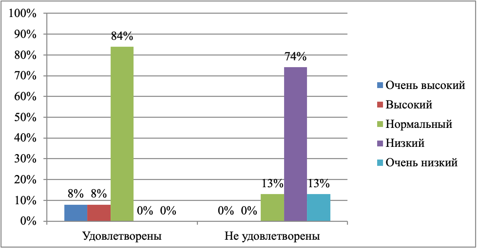 Анализ данных, представленных на рисунке 1, демонстрирует выраженные различия между группами удовлетворенных и неудовлетворенных общением подростков. В группе удовлетворенных (45% выборки) доминируют подростки с нормальным уровнем эмоционального отклика (84%) и средним уровнем коммуникативных способностей (69%). Это указывает на то, что адекватная эмпатия и базовые навыки взаимодействия являются основой для успешной и приносящей удовлетворение коммуникации.