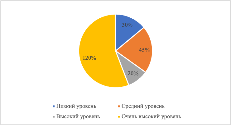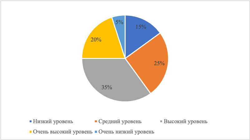 Очень высокий (20%) и высокий (35%) уровень выраженности организаторских склонностей продемонстрировали 55% сотрудников. Они активно стремятся к деятельности, не теряются в новой обстановке, занимаются общественной деятельностью, способны принимать самостоятельные решения. Средний уровень выявлен у 25% сотрудников. Низкий уровень продемонстрировали 15% сотрудников, которые стараются избегать принятия самостоятельных решений.