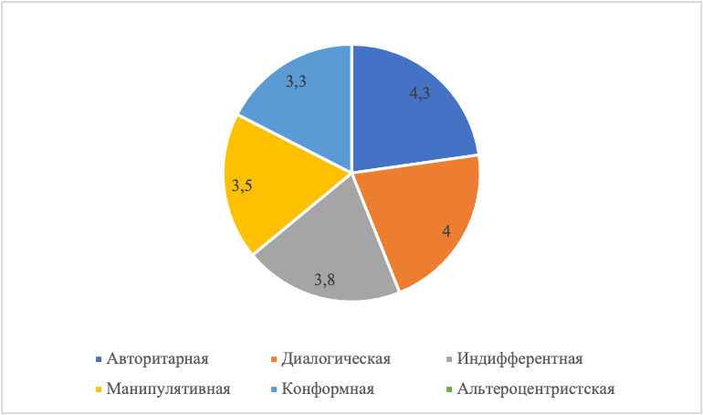 Иерархия ориентаций в общении у сотрудников имеет следующий вид: авторитарная (4,3), диалогическая (4), индифферентная (3,8), манипулятивная (3,5), конформная (3,3), альтероцентристская (2,8).