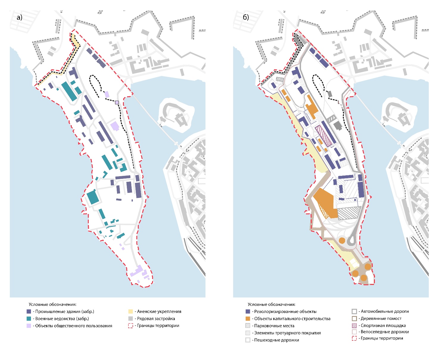 1. Смоляной мыс относится к постиндустриальным и поствоенным территориям прибрежной локализации, сформировавшимся на месте бывших промышленных складов и военных казарм, утратившим свою функцию. Расположение участка на берегу Выборгского залива и его близость к историческому ядру обусловливают его высокий градостроительный потенциал. Проектное решение предполагает ревалоризацию сохранившихся промышленных зданий и казарм с их приспособлением под культурно-досуговые, выставочные и туристско-инфраструктурные функции, а также воссоздание утраченного морского фасада, стремясь к целостной панораме прибрежной застройки. Ключевым элементом преобразования выступает организация общедоступной набережной, интегрирующей природный ландшафт Смоляного мыса в систему городских рекреационных пространств. Ревитализация территории направлена на создание многофункционального культурно-общественного кластера, способного принять часть туристической и досуговой нагрузки (рис. 2).
