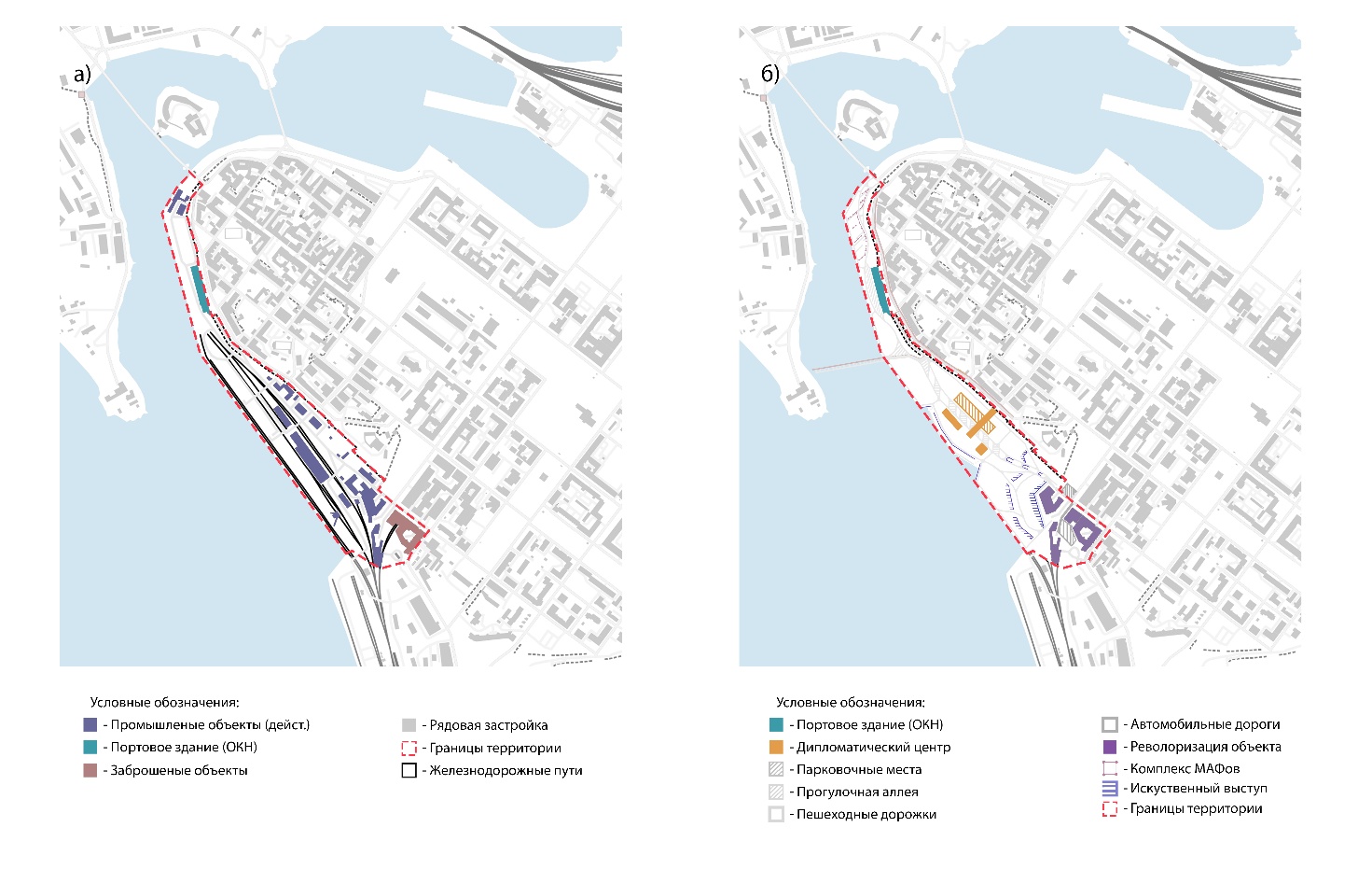 3. Порт Южной Гавани относится к индустриальным прибрежным зонам, исторически связанным с портовой функцией, и в настоящее время сохраняет свое назначение как элемент транспортной инфраструктуры города. Участок расположен в непосредственной близости от Выборгского замка, что определяет его высокую градостроительную значимость и потенциальную роль в формировании туристического маршрута. Проектное решение предполагает развитие существующей функции с ее дополнением общественными и представительскими элементами. Предусматривается создание дипломатического центра, который может стать символом возрождения приграничного сотрудничества и новой точкой притяжения для международных контактов. Структурообразующим элементом архитектурно-планировочной организации территории выступает пешеходная аллея, пронизывающая участок и связывающая причальную зону с историческим центром. В завершении аллеи, на участке, наиболее приближенном к акватории, формируется ансамбль малых архитектурных форм, с панорамным видом на Выборгский замок. В другом конце территории, примыкающем к исторической застройке, расположены заброшенные индустриальные объекты, которые предлагается адаптировать под туристическую инфраструктуру с объектами обслуживания, выставочными пространствами и мастерскими. Ревитализация морского порта позволяет не только актуализировать действующую портовую инфраструктуру, но и создать новое общественное пространство, усиливающее связь исторического ядра с акваторией (рис 4).