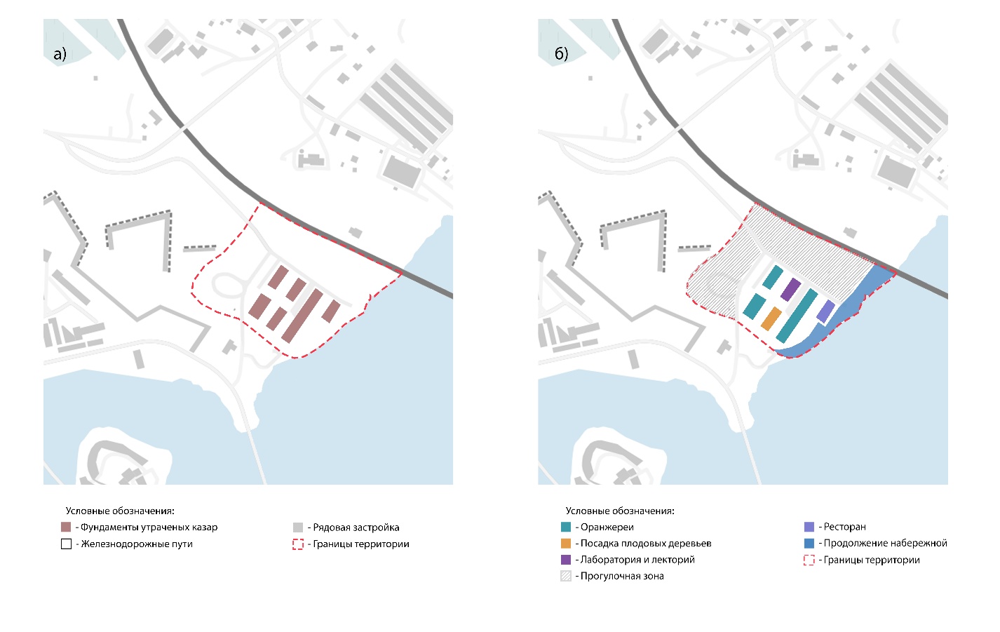 4. Городские оранжереи (участок с фундаментами утраченных казарм) относятся к заброшенным территориям, ранее принадлежавшим военному ведомству. Участок расположен в визуальной близости к Выборгскому замку, в зоне, согласно предмету охраны ИП Выборг, не попадающей в охраняемые панорамы, что создает благоприятные условия для его преобразования. От исторической застройки здесь сохранились фрагменты гранитных фундаментов каменных зданий, формирующие основу для новой застройки. Близость к недавно реконструированной Петровской набережной (2026) — с ее променадом и захватывающими видами на Замок, зонами развлечений и отдыха, нового пешеходного прохода под мостом — обусловливает высокий градостроительный потенциал участка. Проектное решение предлагает строительство Городских оранжерей (тепличного сада); ресторана с видами на воду и замок. С одной стороны, сохраняются следы исторической застройки, с другой - появляются новые общественные пространства, зеленые летом и зимой. Садово-парковые композиции вокруг в сочетании с обновленной набережной интегрируют депрессивную территорию в систему городских общественно-досуговых и рекреационных пространств, усиливая связь исторического ядра с акваторией (рис. 5).