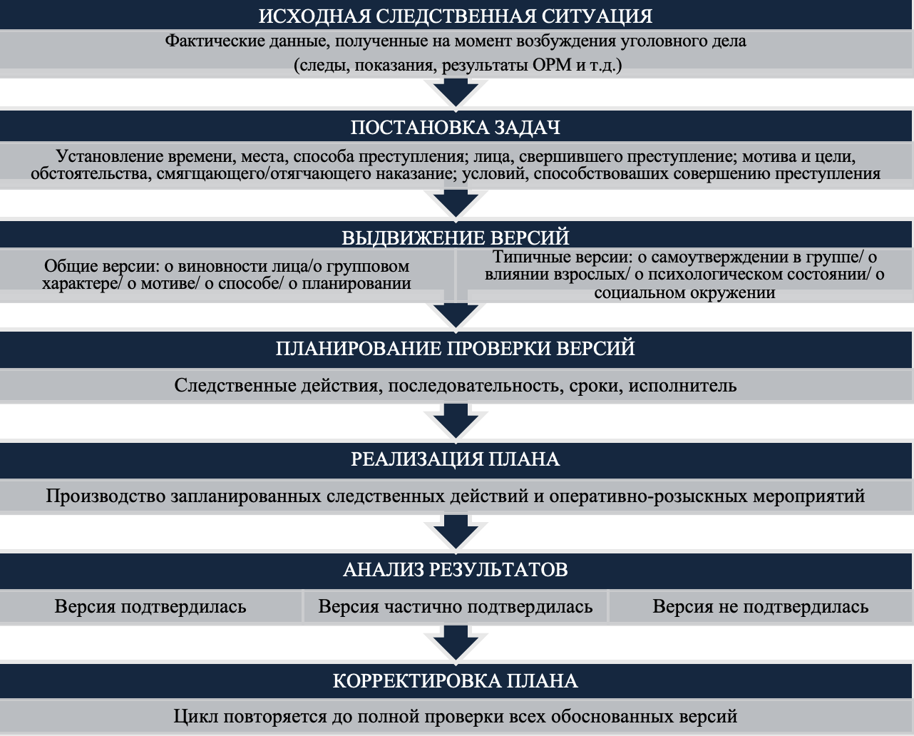 Как справедливо подчеркивает Н.А. Якубович, «качество версий напрямую определяет эффективность всего планирования» [9, с. 92]. Представленная в таблице система версий служит практическим инструментом, обеспечивающим полноту и объективность расследования с первых его шагов. При этом важно отметить, что планирование должно быть адаптировано к психофизиологическим особенностям несовершеннолетних, что предполагает обязательное привлечение специалиста-психолога или педагога уже на стадии планирования первых следственных действий, особенно допросов, для выбора корректной тактики, исключающей давление и учитывающей уровень развития и внушаемость подростка [5, с. 203].