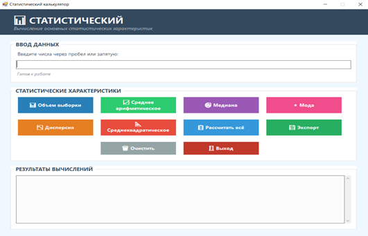 Второй модуль (рис.2) выполняет автоматизированный расчет основных характеристик числовой выборки. Пользователю достаточно ввести массив чисел (через пробел или запятую), после чего программа вычисляет все необходимые статистические характеристики.