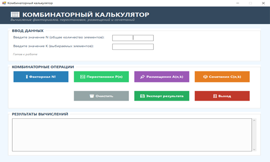 Первый модуль предназначен для решения классических комбинаторных задач (рис.1): вычисление факториалов, числа перестановок, размещений и сочетаний.
