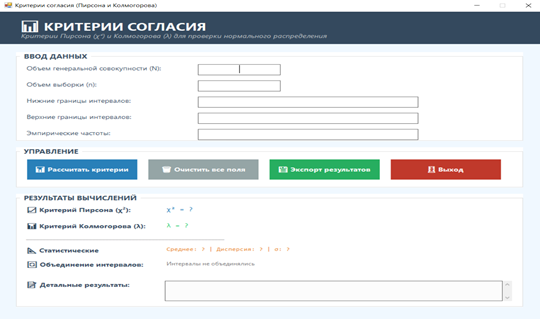 Программа автоматически выполняет весь вычислительный цикл: расчёт среднего и среднеквадратического отклонения по группированным данным, определение теоретических частот, проверку условия применимости критерия Пирсона. При нарушении этого условия модуль самостоятельно выполняет объединение соседних интервалов, о чём информирует пользователя.