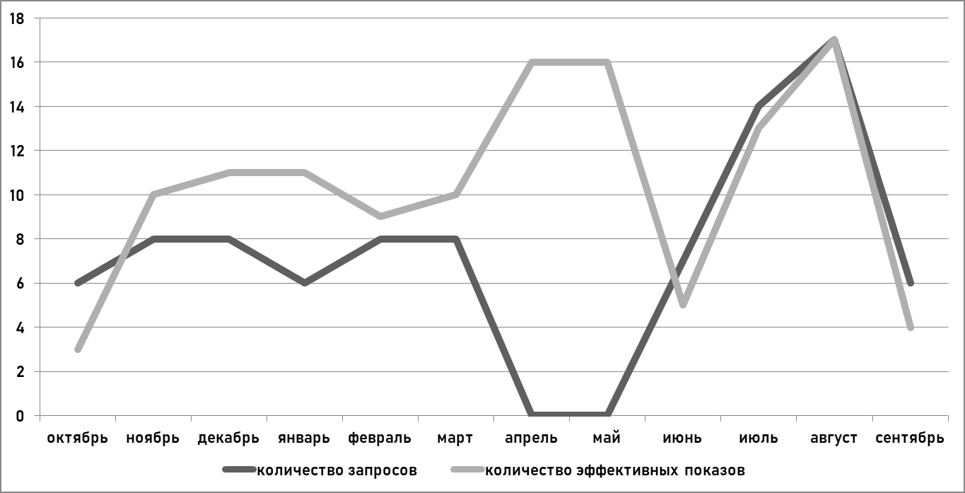 Количество эффективных показов в целом демонстрирует положительную динамику, особенно с апреля по август. В апреле и мае, несмотря на отсутствие запросов, зафиксировано максимальное число показов (по 16), что свидетельствует о хорошей видимости сайта по релевантным ключевым словам. В летние месяцы (июль-август) наблюдается совпадение числа запросов и показов, что говорит о высокой релевантности и эффективности продвижения в этот период.