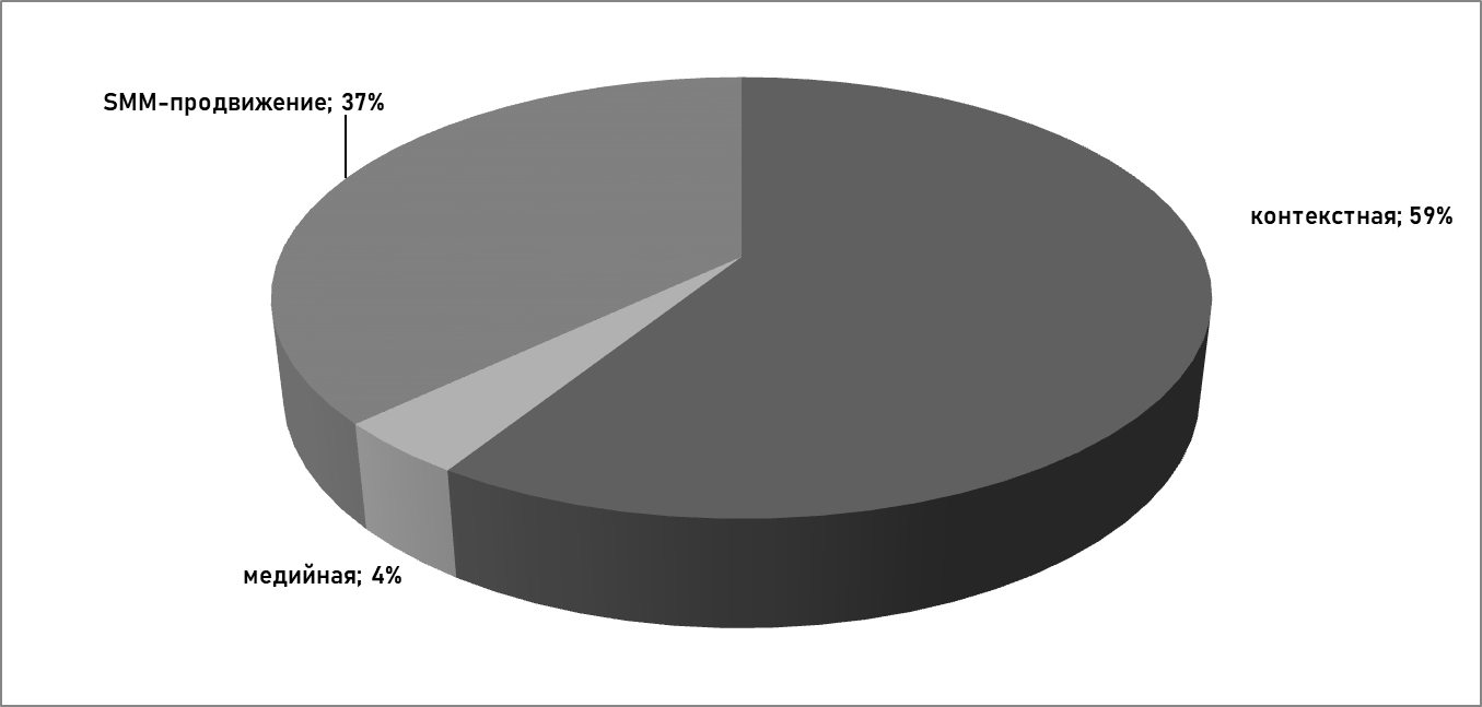 Рисунок показывает, что предпочтение отдается контекстной рекламе и SMM-продвижению, медийная реклама занимает всего лишь 4% от общего количества рекламных объявлений. Очевидно, это связано с высокой стоимостью контакта в медийной рекламе по сравнению с контекстной рекламой и SMM.