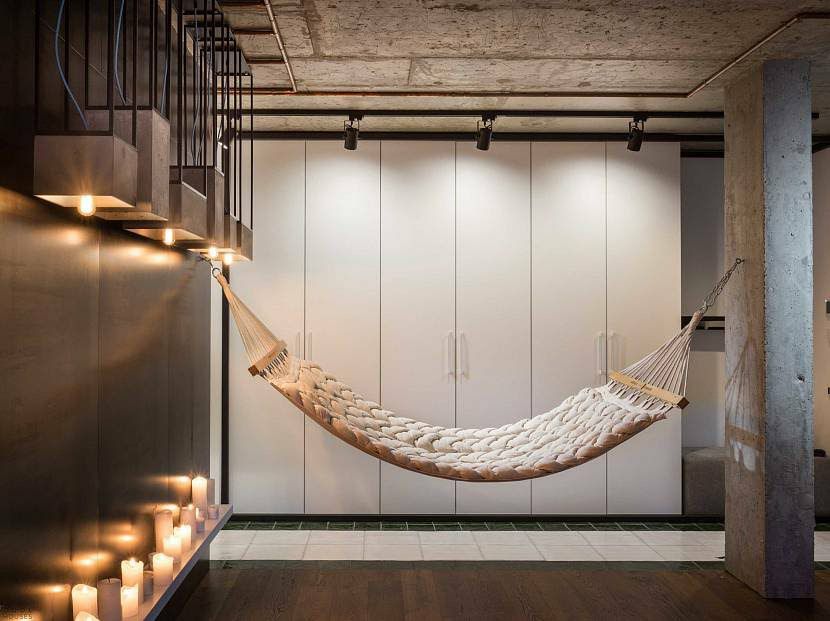 В частных строениях часто остается не задействован рассматриваемый нами элемент. Сегодня можно заметить тенденцию расположения колонны рядом со стеной, в стороне от проходной зоны, где с ее помощью легко фиксируется гамак (рис. 2)[2]. Данный метод превращает зону в полноценное место для отдыха.