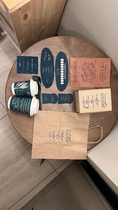 Для напитков используются биоразлагаемые стаканы и бумажные крышки, что подчеркивает экологичный подход бренда. Меню выполнено на плотной шероховатой бумаге, создающей приятное тактильное ощущение; упаковка и пакеты крафтовые, а также брендируются вручную при помощи штампов, благодаря чему сохраняется эффект ручной работы и индивидуальности.