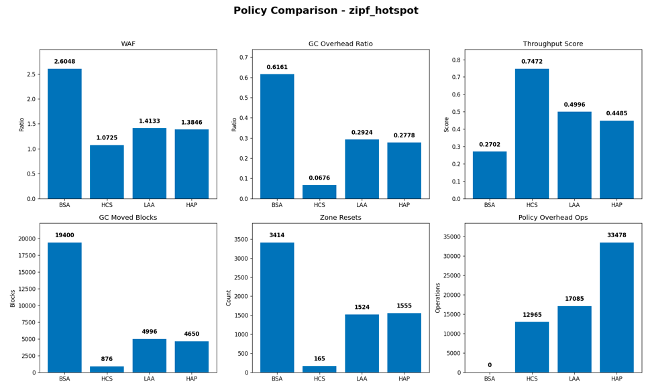 In the zipf_hotspot scenario, which represents strongly skewed access with a concentrated hot set, HCS achieved the lowest WAF at approximately 1.07, while BSA reached approximately 2.60. LAA and HAP also improved on the baseline, with WAF values of approximately 1.41 and 1.38, respectively. These results indicate that explicit hot/cold grouping is particularly effective under strong access locality, where separating highly volatile data from more stable data reduces unnecessary relocation during garbage collection.