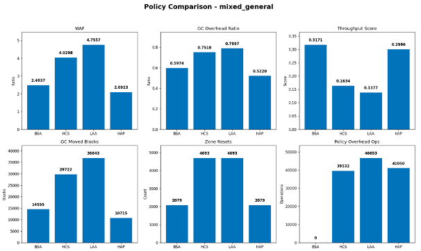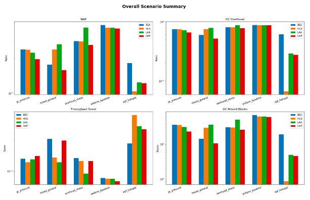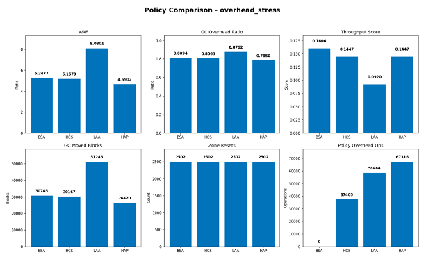 The overhead_stress scenario highlights the trade-off between placement intelligence and policy cost. In this case, HAP achieved the lowest WAF at approximately 4.65, followed by HCS at 5.17, BSA at 5.25, and LAA at 8.08. This result demonstrates that added policy complexity does not automatically yield better behavior. If the classification strategy is not well aligned with workload dynamics, metadata tracking and misgrouping may offset the intended benefits.