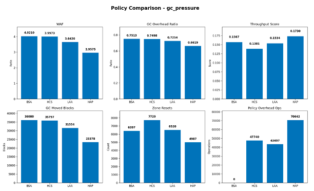 Under gc_pressure, where namespace capacity is tighter and write pressure is higher, HAP again produced the lowest WAF at approximately 2.96. By comparison, LAA reached 3.64, while HCS and BSA both remained near 4.00. This result indicates that the hybrid policy is more resilient when reclamation pressure is elevated and placement decisions directly affect cleaning frequency.