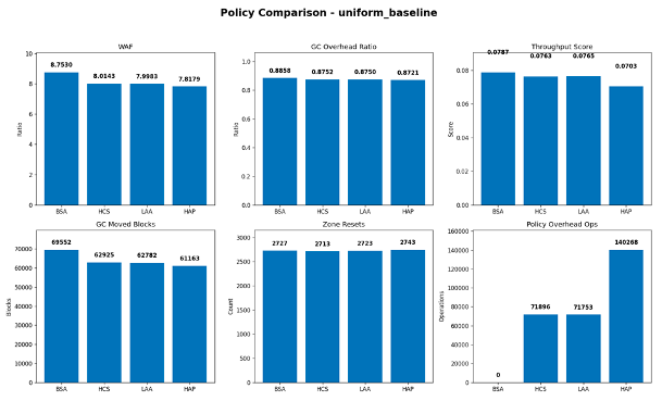 In the uniform_baseline scenario, the gap between policies is narrower than in hotspot-dominated or mixed workloads. HAP still achieved the lowest WAF, approximately 7.82, followed by LAA at 8.00, HCS at 8.01, and BSA at 8.75. This indicates that the advantage of workload-aware policies becomes more pronounced when workload structure is more distinctive, whereas under relatively uniform pressure the improvement margin is smaller.