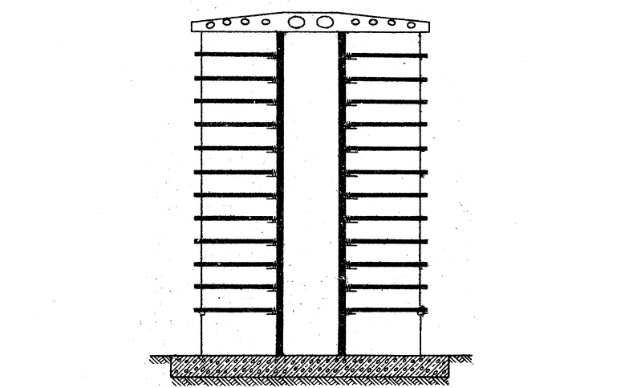3. К числу сейсмостойких каркасных зданий относятся конструктивные системы с подвешенными этажами. Здания висячей конструкции характеризуются мощной опорной основой, центральным ядром жесткости, выполненным из монолитного железобетона, к которому шарнирно прикрепляются промежуточные элементы с подвесками и перекрытиями. Нагрузки равномерно передаются на фундамент через подвесные элементы, что обеспечивает повышенную устойчивость здания в целом.