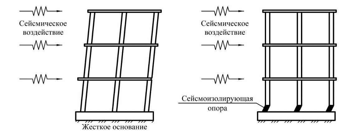 Рисунок 6. Схема сейсмического воздействия на здание с сейсмоизолирующими опорами (2),