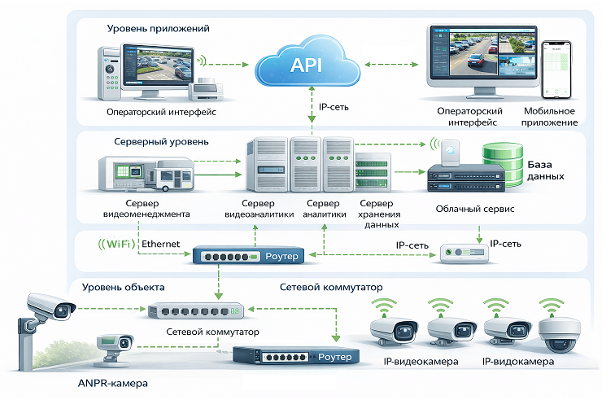 В основе архитектуры системы лежит комплекс аппаратных и программных компонентов, объединённых в единую информационную среду. Ключевую роль играет подсистема видеонаблюдения, которая обеспечивает сбор первичных данных. В качестве источников информации используются IP-камеры, устанавливаемые на парковочной территории и в зонах въезда и выезда. Камеры формируют видеопоток, который передается по сети на сервер или видеорегистратор для дальнейшей обработки [2].